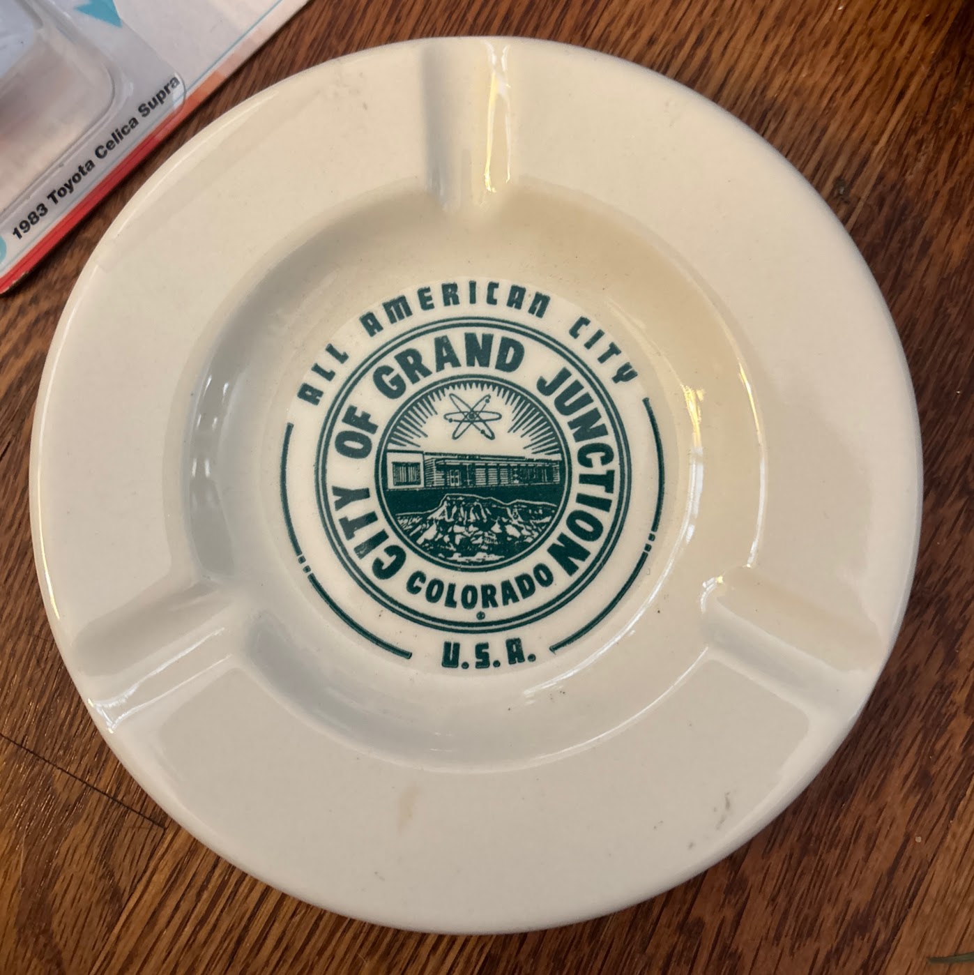A Grand Junction ashtray with Grand Junction's city seal, used from the 50s through the 70s (I beleive). The design features what I think is Mt. Garfield, City Hall, and an atomic symbol. Grand Junction was known for being a uranium mining boomtown (more info here). I'm a big fan of nuclear history :3.